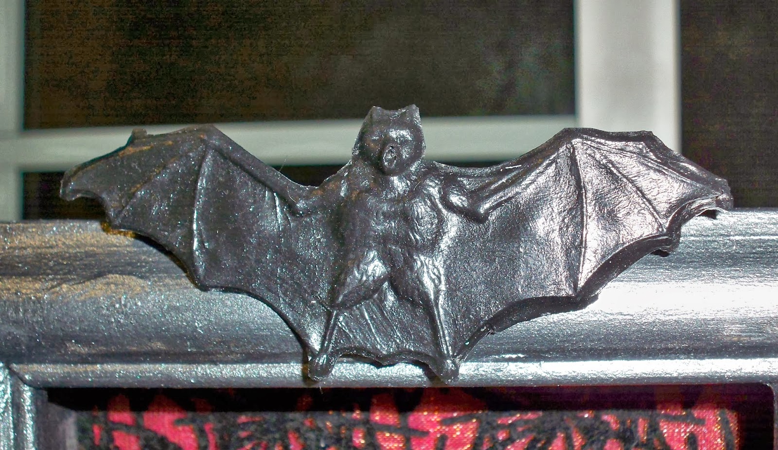 I had the metal pumpkin in my stash, attached that to the back panel. I had made the bat already; he is from a mold I made with Amazing Mold Putty (the original of the bat is a metal stamping I have) and then he was cast out of Amazing Clear Cast Resin. I painted him with Golden Carbon Black and attached him to the top of the shadow box. Done!