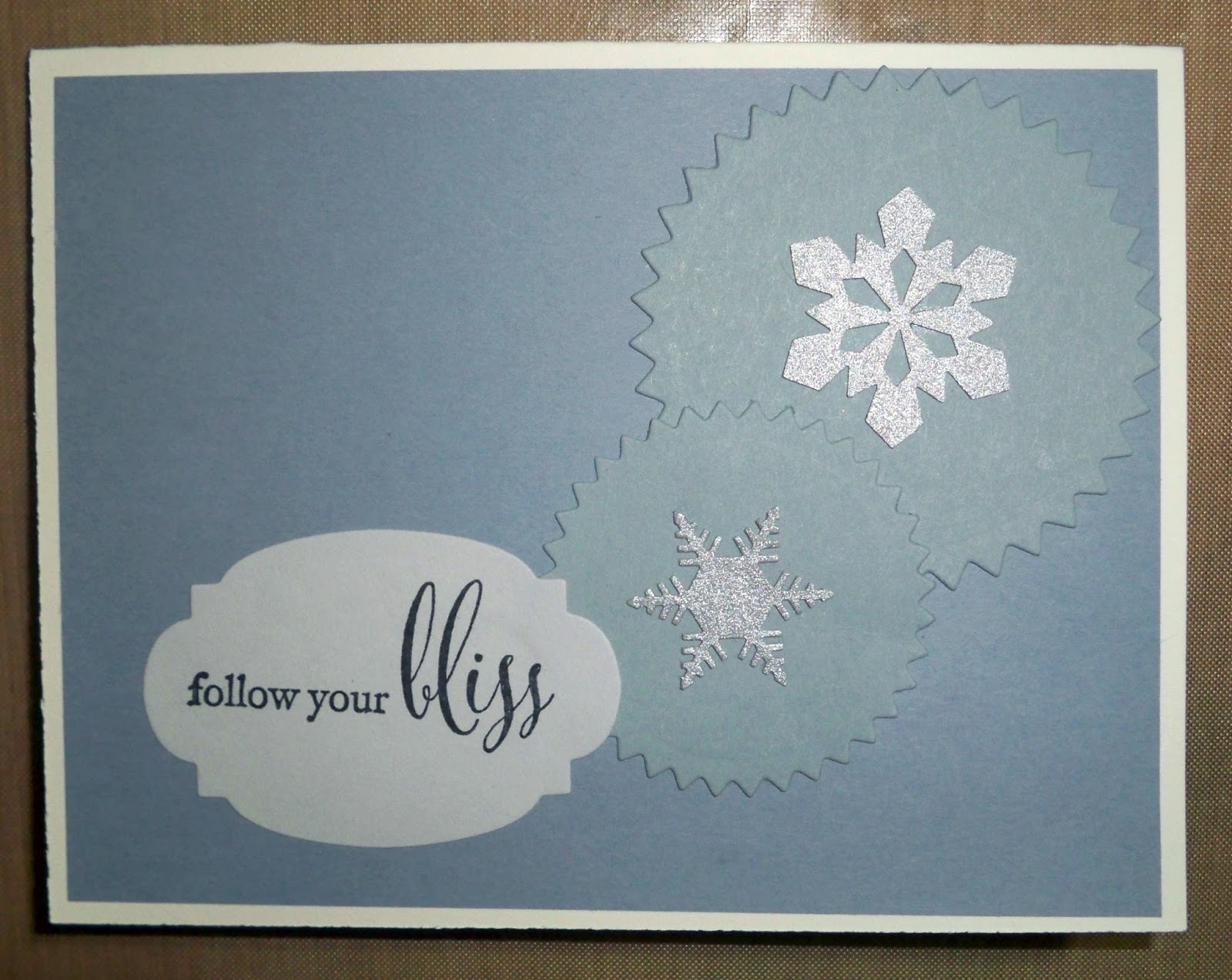 After I dug through my stash (which took forever!) to try to find 3 papers I felt matched the color palette, I decided how I was going to incorporate the sketch into my card. The sentiment stamp is brand new, never been inked, and I was dying to use it, so that was a given. I punched the snowflakes using a set of snowflake punches I got ages ago when the company was going out of business. I remember I got an awesome deal! So, I punched the snowflakes using silver paper and set them aside.