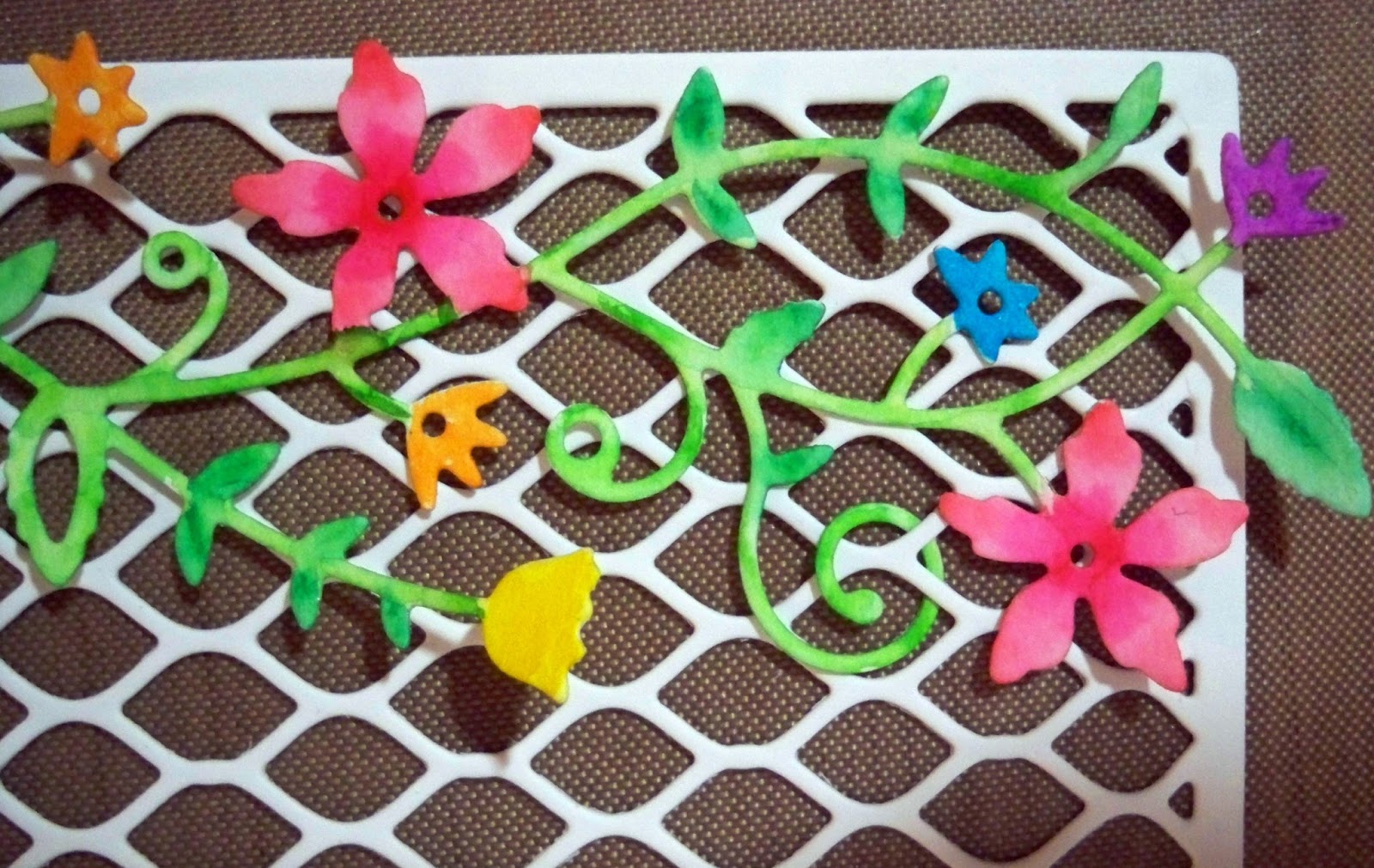 I chose the sentiment from a set of free stamps I had gotten and stamped it onto white card using bubble gum pink ink. Lastly, I attached the fence and flowers to the card base, then I attached the sentiment, gently placing it under the flowers and lining it up with the fence.