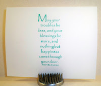 I then cut the sentiment out with the cross stitched rectangle. I used an ancient {I'm not even going to guess} corner punch on the patterned paper, attached that to my card, and put it under the tile on my desk to dry thoroughly. The tile