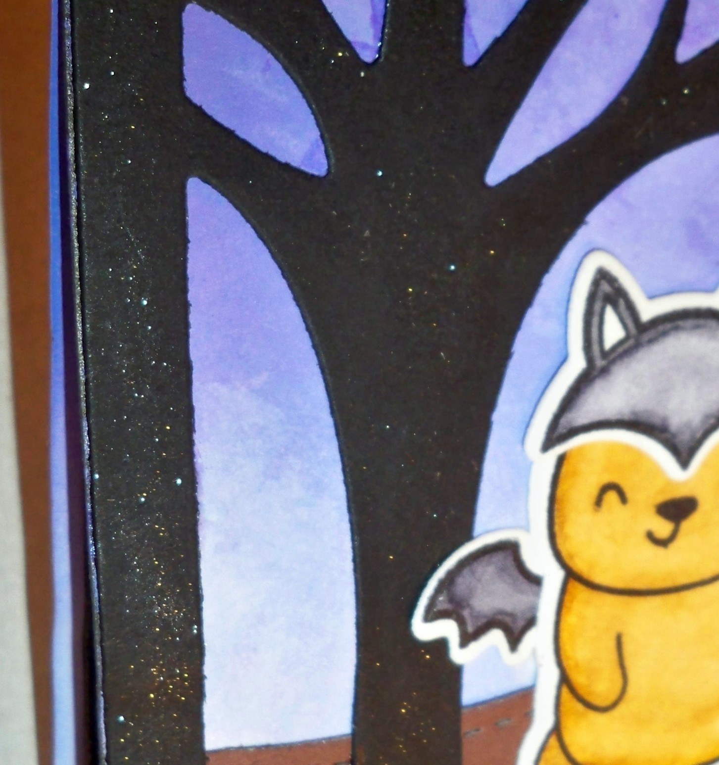 Working on the inside of the card next, I cut a bunch of stars out of glitter card and mirror card. I placed them on the top, inside of the card as I wanted that to be my Halloween eve sky. I started choosing-and-placing the costumed animals on the hills that I had glued to the bottom inside of the card but, since I wasn't sure about what the actual mechanics of the card were going to take, I didn't glue any of the critters on the inside at that point.