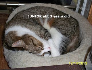 - Junior on the other hand was not a social cat at all when we first got him. He and Bud lived together in the shelter, but, he was very freaked out when we got him home. He didn't hide, but he was very skittish. Turns out, he had been to the shelter TWICE in his short life and his last "owners" literally kept him for one year and returned him. That happened to him 2 times - people adopted and returned him twice (can you even imagine?) So I can understand why he was a bit mistrusting. He has warmed up quite a bit now. He is definitely the fighter and protector in the family and vehemently protects our home against any other animals, or leaves, by sitting in the window and meowing up a storm. He will also sit in the window and call to you if you are outside. Turns out Junior had a dental disease, common in his type of cat, where his teeth were literally crumbling. About a year ago we had all his teeth removed and he is a brand new cat! Talk about social; he LOVES attention, LOVES to play and is never far from a person. It's amazing how he has turned around! He is also quite a Casanova - he adores playing with his sisters!!