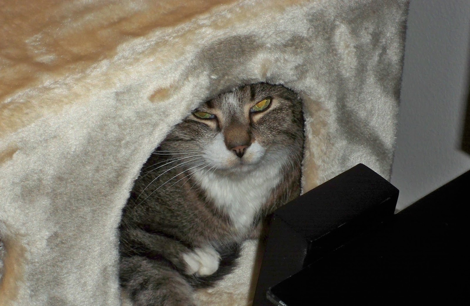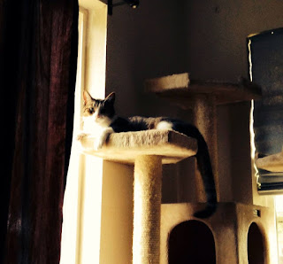 | Bud is walking the curtain rod - that's Sylvester on the cat condo |