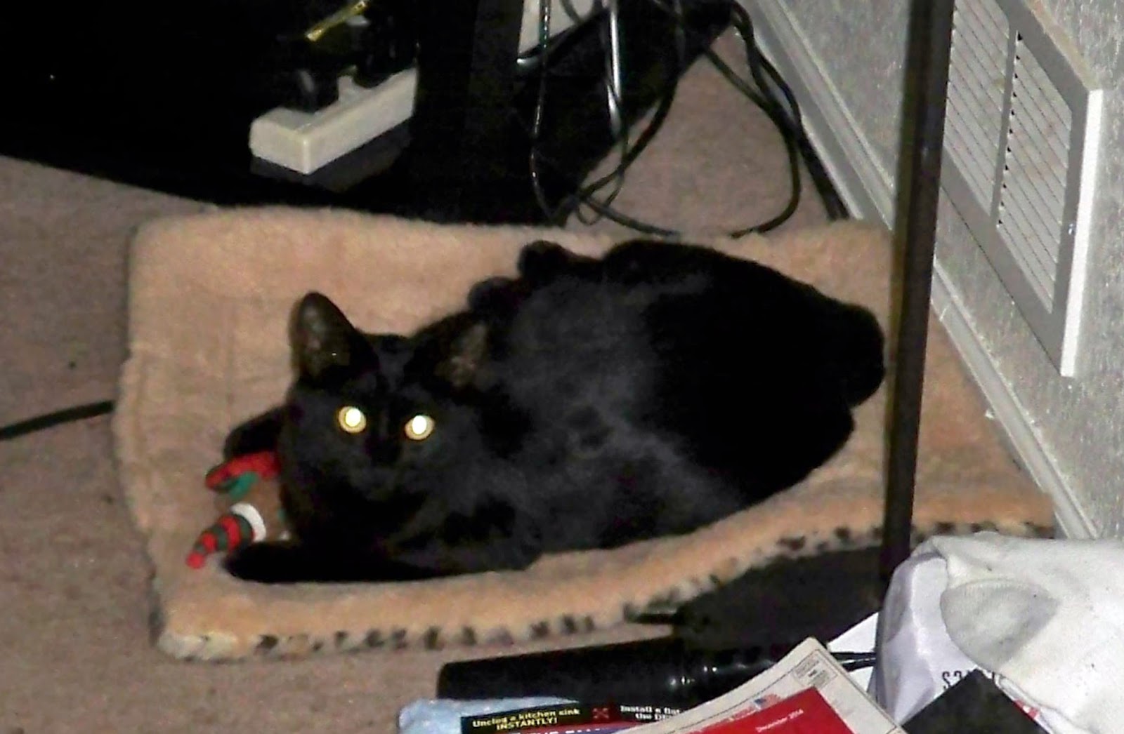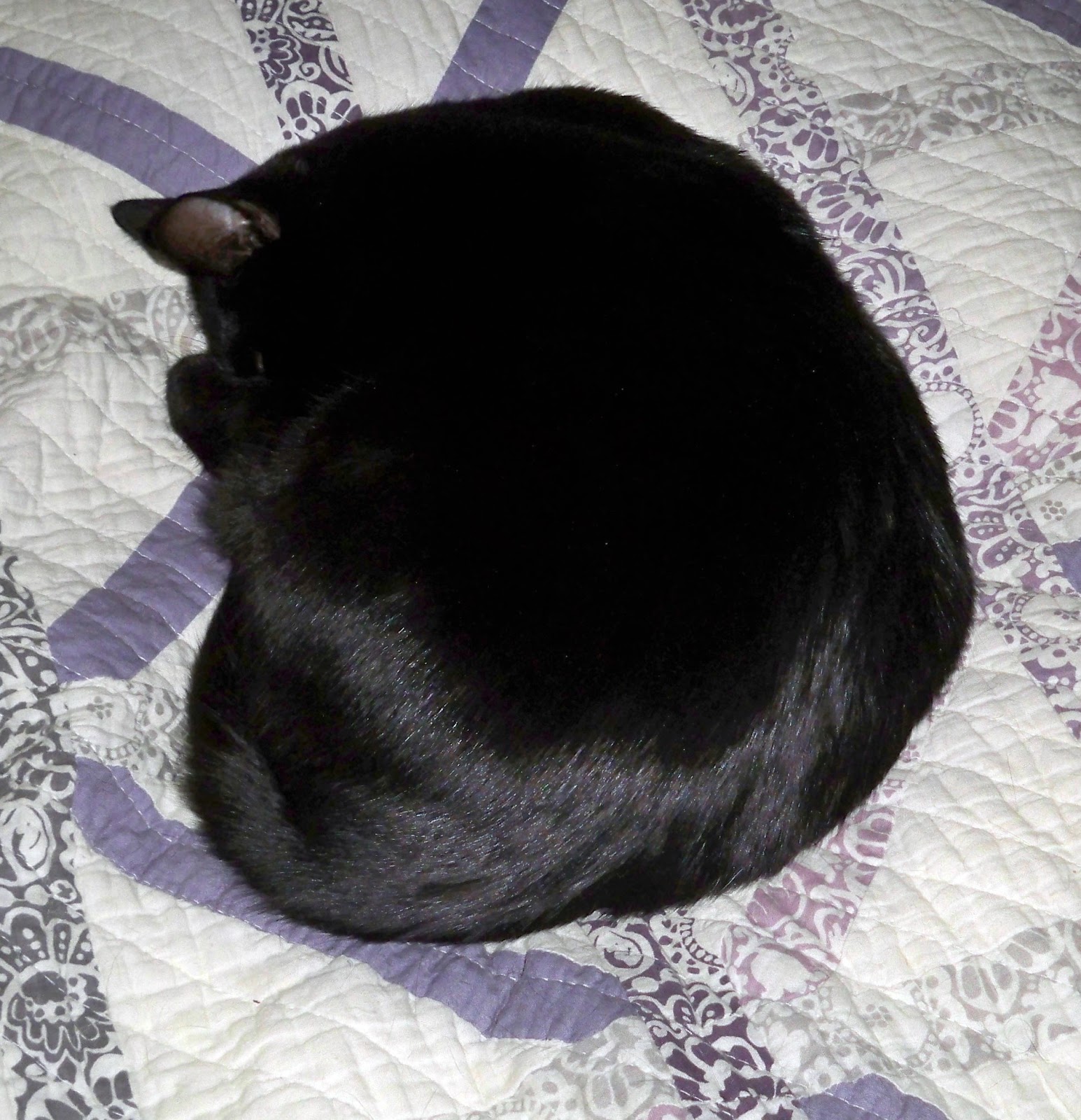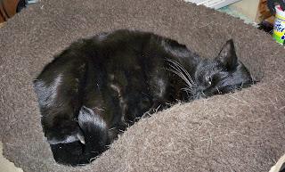 - I had always wanted a black cat and I happened to be on Craigslist and saw an ad for a free black kitten. So we went and got Mew. We had a heck of a time naming her, but if you ever get to meet her, it will be obvious why we chose the name we did. She literally "mews" - she mews running up and down the hallway, trills as she walks, and makes all manner of cat noises but rarely meows. She could fit in one hand when we got her and now she is a little over 2 years old. Poor dear got spayed and blew up like a balloon (I can relate). She is one of the most affectionate cats I have ever had and loves to be picked up, cuddled and having her belly rubbed. She loves to get and give attention to the other cats. She bathes everyone (except Monster, who at least will tolerate being in the same room as her now) and will seek out the other cats to get a bath. She'd be happy if I could carry her around all day long. We clipped all of their nails recently (such fun!) and Mew literally lay on her back and stayed there while I clipped her back nails - I promise to get a picture of this next time so you can see. There are more pics of her if you scroll down.