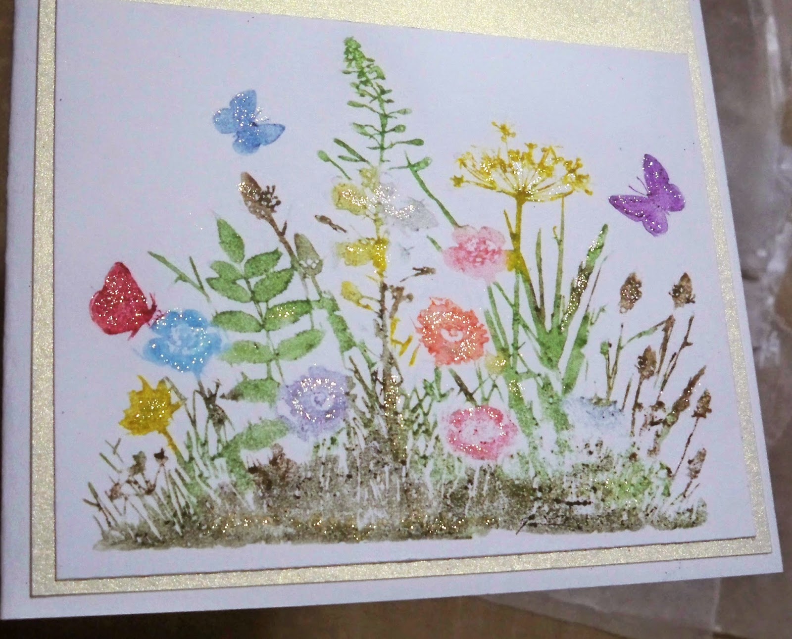 Lastly, I cut a piece of the light yellow shimmer card, cut it down to size and mounted both my sentiment and image on that, then mounted that onto the blank white card base.